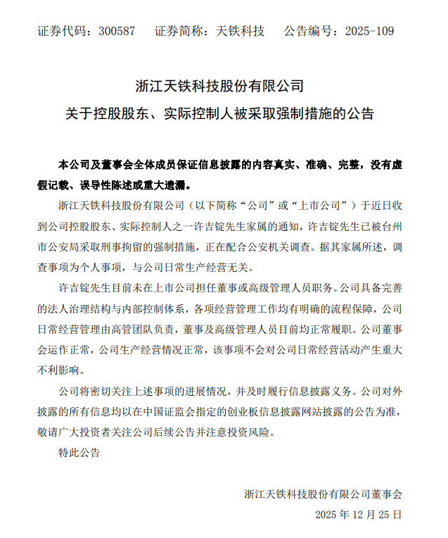 12月25日,天铁科技(300587)(300587.SZ)公告称,公司控股股东、实际控制人之一许吉锭已被台州市公安局采取刑事拘留的强制措施,调查事项为个人事项,与公司日常生产经营无关。许吉锭目前未在上市公司担任职务,公司日常经营管理由高管团队负责,董事及高级管理人员正常履职,董事会运作正常,生产经营情况正常,该事项不会对公司日常经营活动产生重大不利影响。